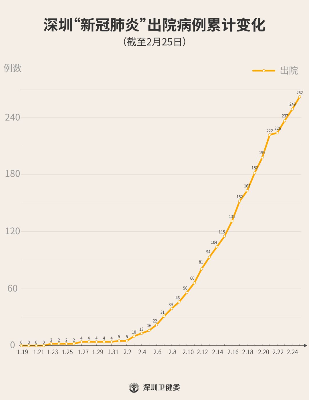 2月25日下午,經(jīng)專家組會診,深圳有13名新型冠狀病毒肺炎確診患者出院,累計達262人,連續(xù)23天有人出院。