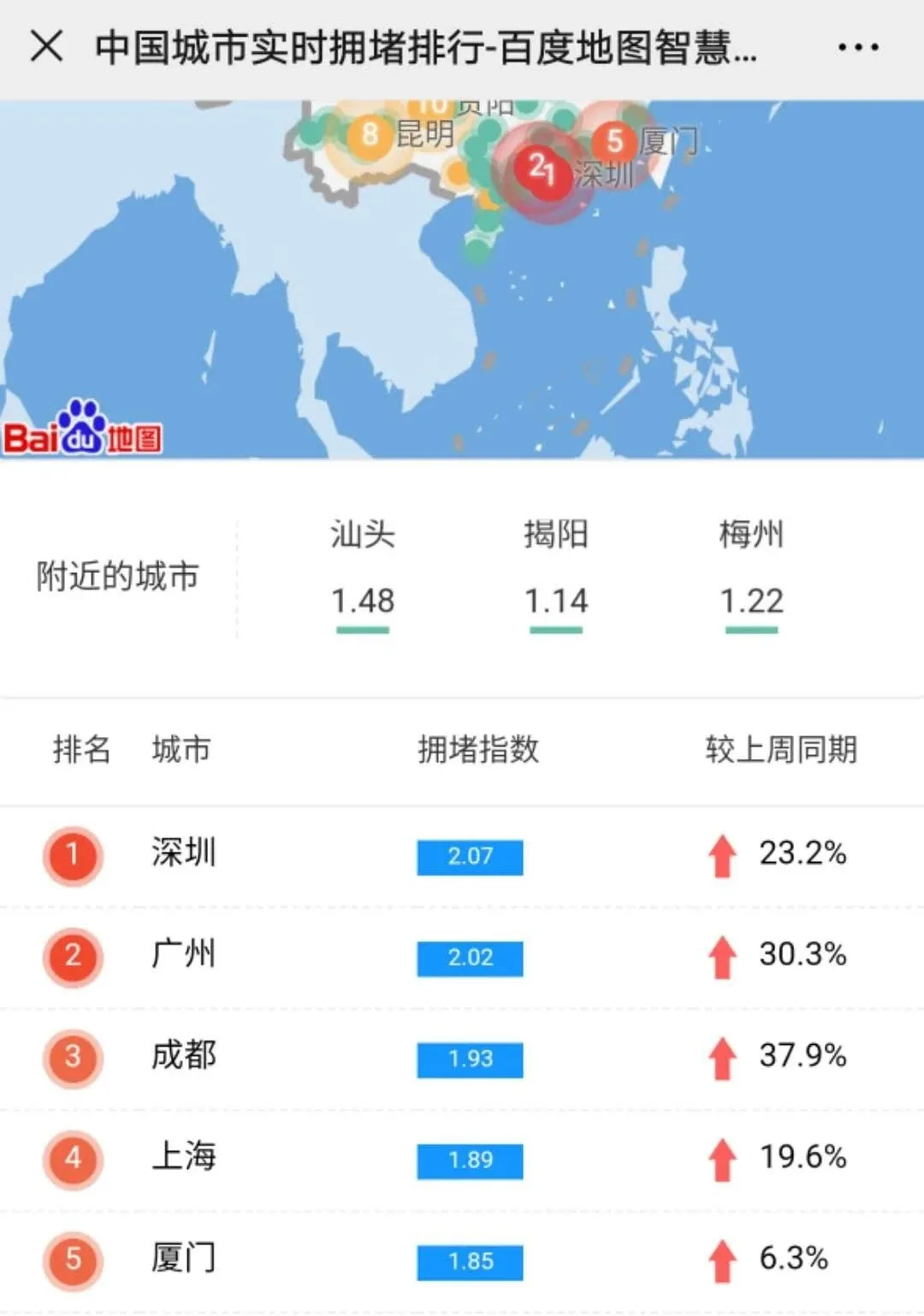 據(jù)百度地圖提供的中國(guó)城市實(shí)時(shí)擁堵排行來(lái)看,3月2日19時(shí)許,深圳擁堵指數(shù)為2.07,位居全國(guó)榜首。