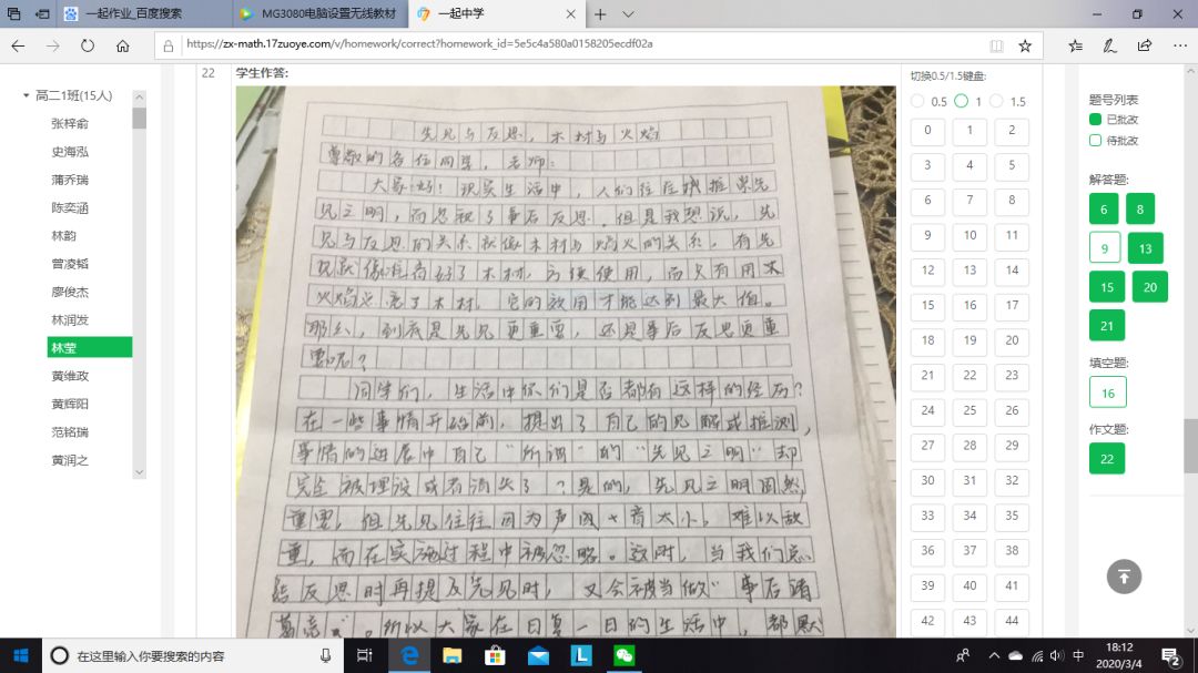 早在網(wǎng)課開始第二周,針對老師們對網(wǎng)課效率不高的顧慮,高二年級就做了一次網(wǎng)上調(diào)查,絕大部分老師贊成進行一次網(wǎng)上考試,以檢驗網(wǎng)課的學習效果,以便調(diào)整教學。之后,學校開始著手準備網(wǎng)上考試,向技術平臺提交學生和老師信息,下發(fā)《一起作業(yè)學生注冊登錄指引》和《一起作業(yè)教師作業(yè)批改操作指南》。年級各備課組開始命題,為了檢驗二實“線上學堂”的實效,學校要求命題的范圍以直播課內(nèi)容為主,兼顧寒假作業(yè)。考前一周,各備課組都上交平臺進行試卷制作。2月26日,網(wǎng)上作業(yè)批改功能正式上線,高二年級要求備課組在考試之前至少利用線上平臺布置批改一次網(wǎng)上作業(yè),積累經(jīng)驗,提醒平臺改進不完善的問題,及時更新,同時讓學生和老師熟悉操作技巧。備課組在考前都向?qū)W生發(fā)布了考試注意事項,要求學生豎拍照片,注意字跡大小和拍照清晰度,單題上傳,試卷在閱讀頁面和題目設置也做了優(yōu)化,大大方便了學生答題,有效減輕老師改卷負擔,提高了閱卷的效率。