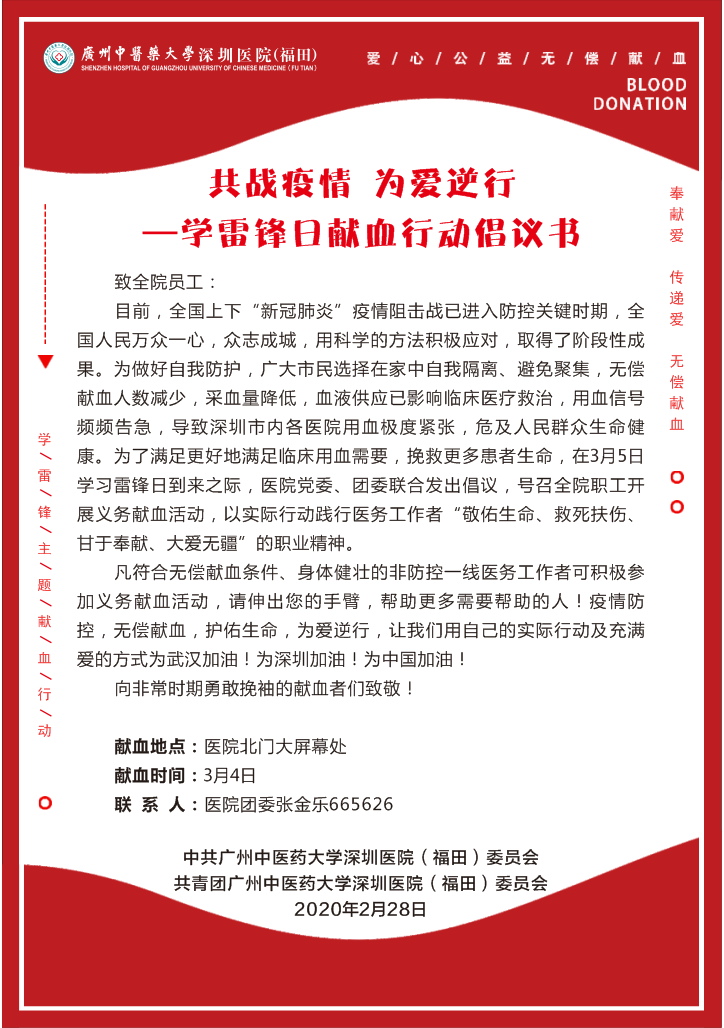 深圳新聞網(wǎng)3月5日訊(見(jiàn)圳客戶端、深圳新聞網(wǎng)記者 何靜 通訊員 馬曉群)受疫情影響,深圳市內(nèi)的血站頻頻告急,在這非常時(shí)期,為了更好地滿足深圳市臨床用血需要保障市內(nèi)血液供應(yīng),挽救更多患者生命,恰逢第57個(gè)“3.5學(xué)雷鋒日”到來(lái)之際,廣州中醫(yī)藥大學(xué)深圳醫(yī)院黨委、團(tuán)委聯(lián)合發(fā)出“共戰(zhàn)疫情,為愛(ài)逆行”倡議書,號(hào)召全院職工開(kāi)展無(wú)償獻(xiàn)血活動(dòng)。