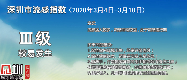 見圳客戶端·深圳新聞網(wǎng)2020年3月9日訊(見圳客戶端、深圳新聞網(wǎng)記者 劉夢婷)根據(jù)深圳市疾控中心公布的深圳市流感指數(shù),3月份以來,深圳均顯示為Ⅲ級(較易發(fā)生),目前深圳處于流感流行期,流感活動較強(qiáng),流感病人較多。