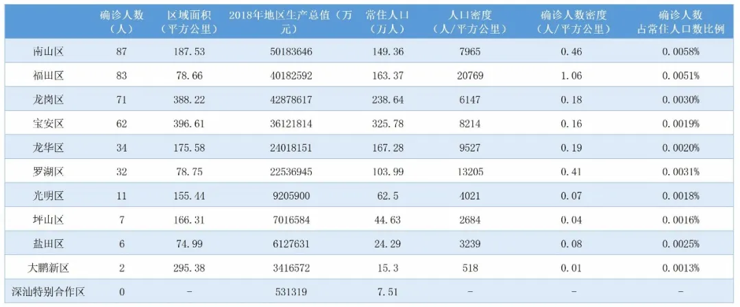 ▲很明顯,人口稠密地區(qū)確診病例較多,福田、南山、羅湖確診人數(shù)在單位面積中密度高;南山、福田兩區(qū)確診人數(shù)在總人口數(shù)當中占比高。