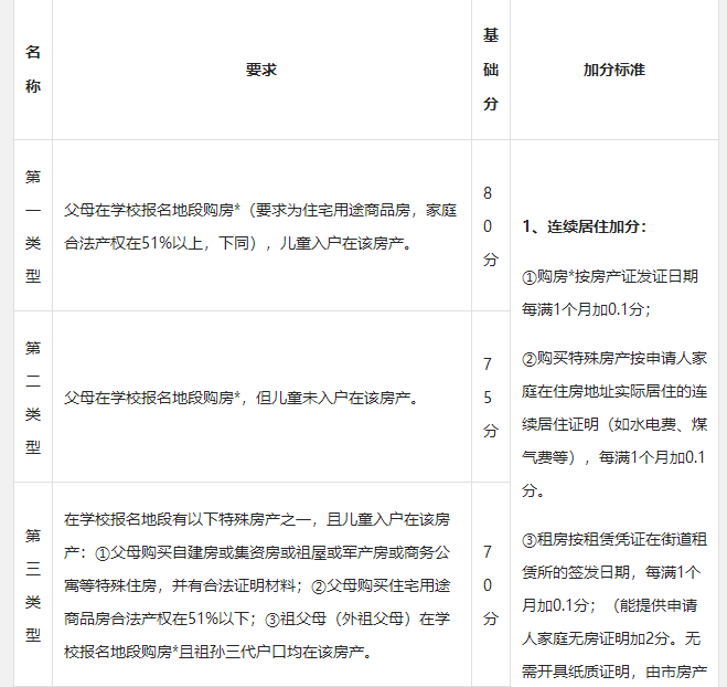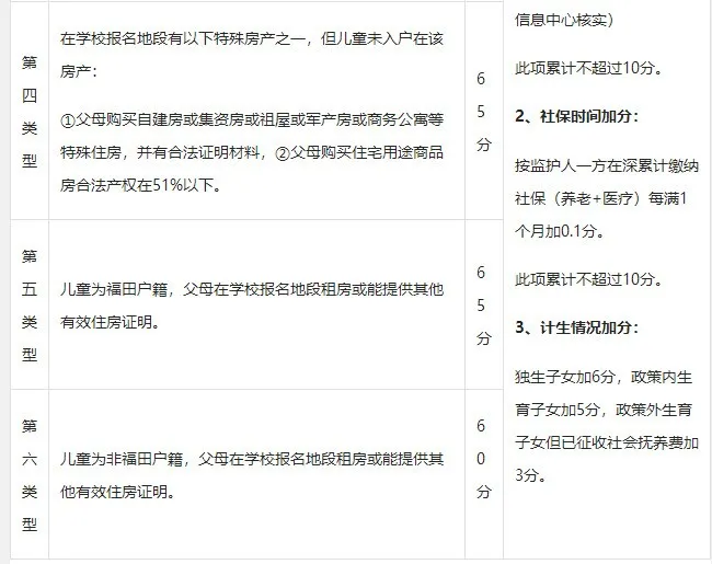 此外,"寶安戶籍,學(xué)區(qū)自購(gòu)商品房"、"深圳其他區(qū)戶籍,學(xué)區(qū)自購(gòu)商品房"、"寶安戶籍,無房租房"、"深圳其他區(qū)戶籍,無房租房"、"非深戶購(gòu)房"、"寶安戶籍,有房租房"等情況分別在原有基礎(chǔ)分上另加5分。