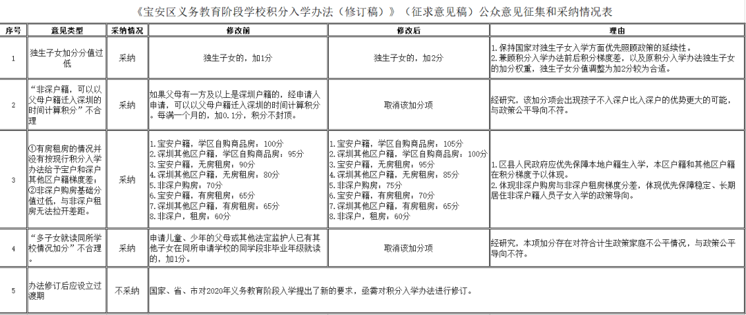 在新修訂稿中,寶安區(qū)教育局結(jié)合市民意見反饋,擬將獨(dú)生子女加分由1分調(diào)整至2分,并取消兩項(xiàng)加分項(xiàng),同時(shí)對(duì)部分情況分值進(jìn)行調(diào)整,以體現(xiàn)積分梯度。