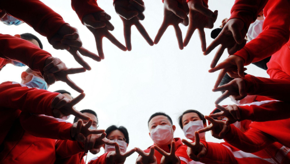 ▲深圳醫(yī)療隊(duì)員徐平(中)、范昭(后排右一)、王玲(右二)、徐佳卿(后排右二)、陳潔麗(右一)與監(jiān)利縣委黨校隔離點(diǎn)工作人員交流。
