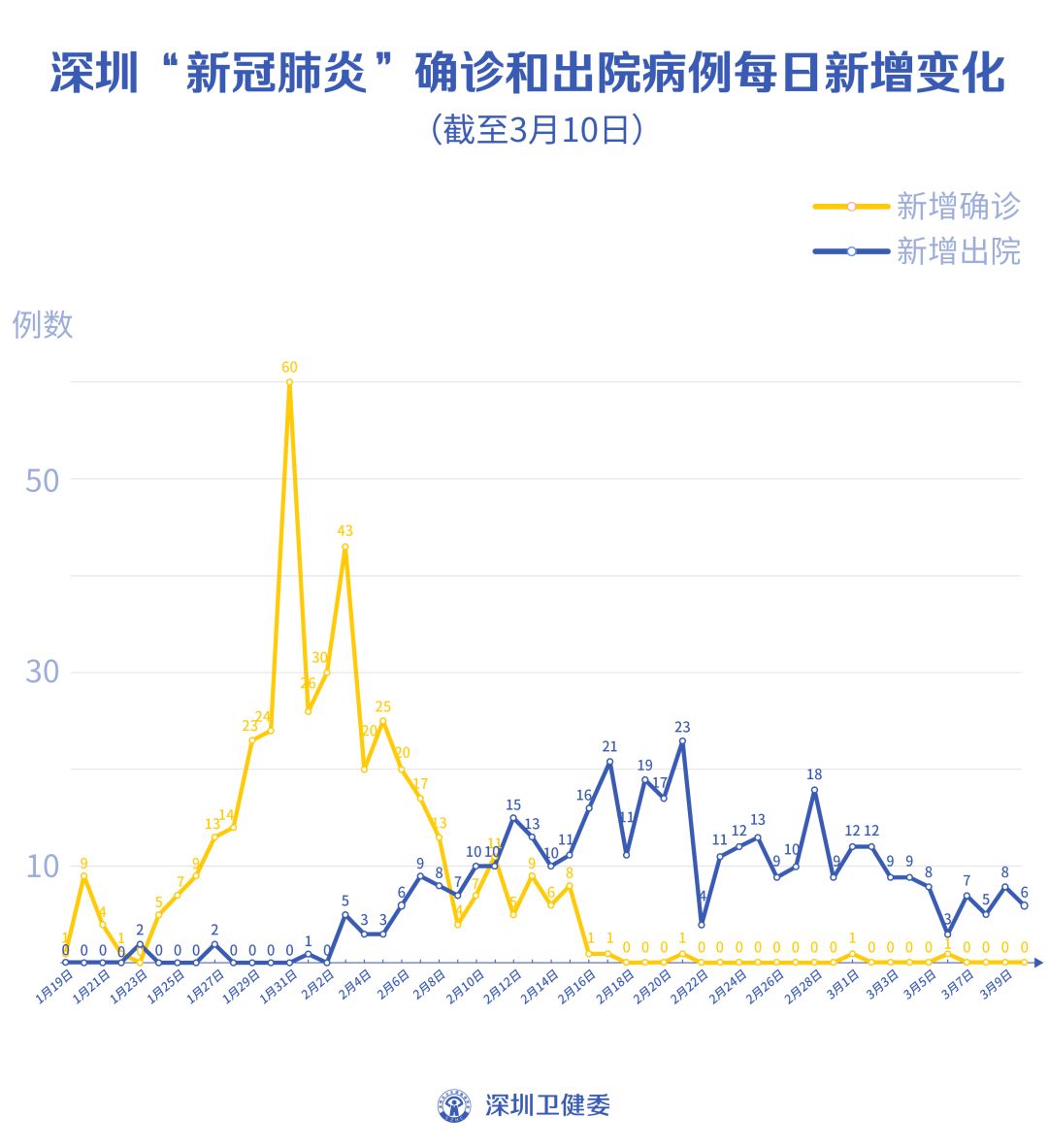 截至3月10日24時,深圳累計報告“新冠肺炎”確診病例419例。3月10日當天全市無新增確診病例,當天出院病例6例(從2月26日起不再公布出院個案)。