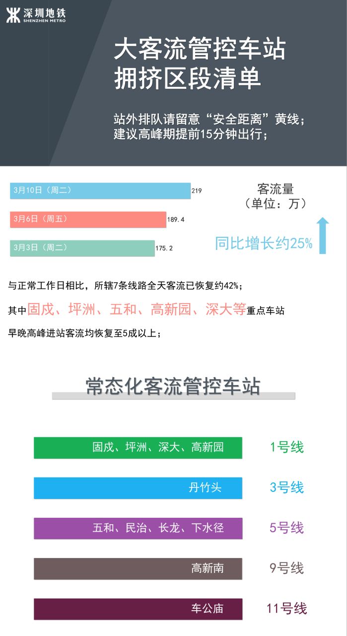 3月10日(周二),深圳地鐵所轄7條線路客流量已達(dá)219萬人次,為防止客流激增而造成乘客過度擁擠,深圳地鐵已在11座大客流站點,實行常態(tài)化客流管控。另外有17座重點車站,也將視客流情況隨時采取客流管控措施。