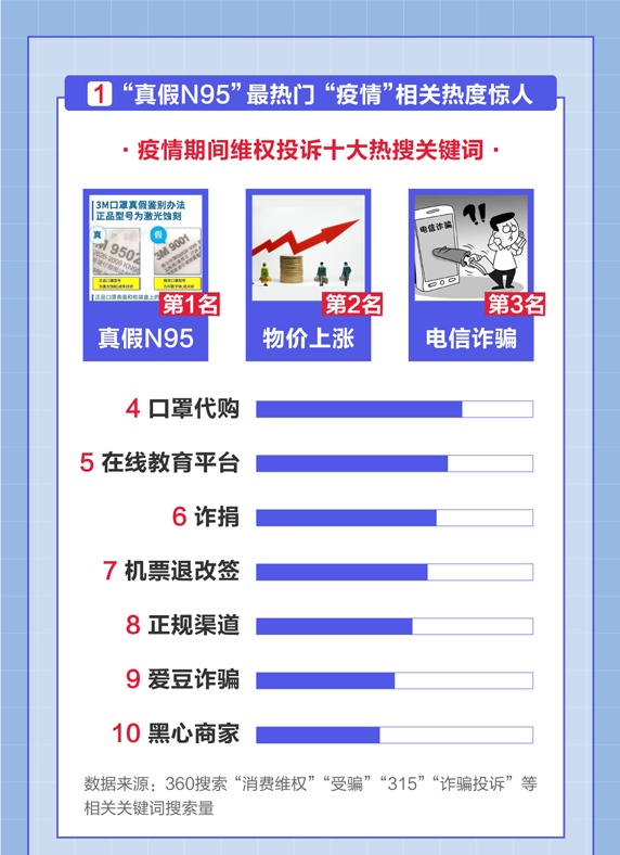 深圳商報(bào)2020年3月15日訊 360搜索、360瀏覽器今日發(fā)布《315消費(fèi)者維權(quán)數(shù)據(jù)報(bào)告》(以下簡(jiǎn)稱《報(bào)告》)。報(bào)告顯示,“真假N95”、“口罩代購(gòu)”等與口罩質(zhì)量相關(guān)的訊息成熱議話題。