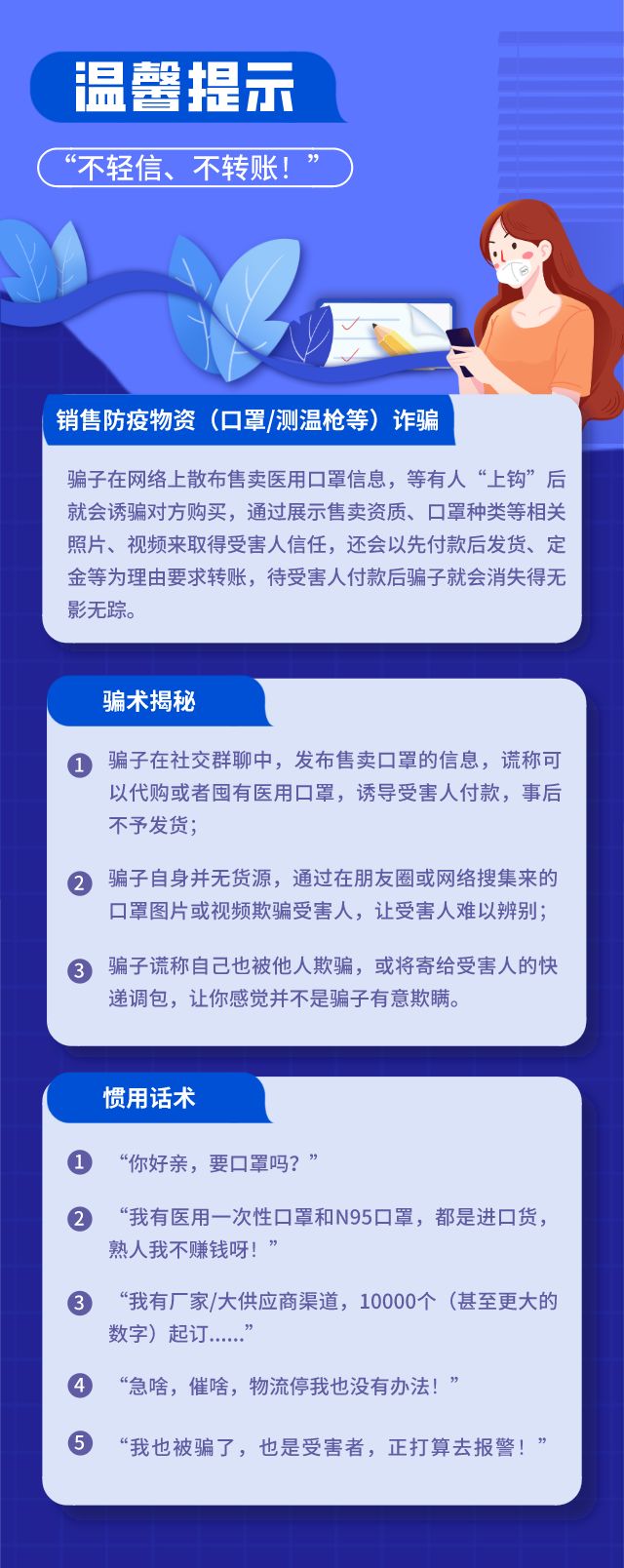“我來報警!群里有人騙我口罩錢!” 3月4日,事主李小姐匆匆來到深圳市公安局福田分局香蜜湖派出所報案并講述了自己被騙的經(jīng)過。 此前李小姐在某社區(qū)賣菜群里,看到了一名群友發(fā)布“口罩資源”的信息,于是加其為好友,對方向李小姐展示了售賣資質(zhì)以及售賣口罩的樣品,一步步讓李小姐放松了警惕,雙方以1.75元/個醫(yī)用口罩、9元/個N94口罩的價格談妥交易。 隨后李小姐通過轉(zhuǎn)賬先向?qū)Ψ劫徺I了一批口罩。李小姐覺得對方還挺靠譜的,就又分四次向?qū)Ψ睫D(zhuǎn)賬,分別郵寄給自己不同的朋友,累計向?qū)Ψ睫D(zhuǎn)賬了990元。 不料所有的錢轉(zhuǎn)過去之后,這個群友卻消失了,發(fā)信息不回,打視頻不接,雖未拉黑但也沒任何回應(yīng)?!笆謿馊?,被騙的錢雖然不多,但是一定要給詐騙分子嚴(yán)懲!”李小姐對民警這樣講述道。 民生小案無小事,數(shù)百元現(xiàn)金被騙,電單車被盜……這些看似平常的一件件“小”案,背后牽連的卻是廣大群眾的幸福感、安全感。 香蜜湖派出所民警聚力破小案,服務(wù)大民生,做到有案必偵,快偵快破。經(jīng)多方面調(diào)查后,最終確定了嫌疑人的身份——游某。3月9日11時許,福田警方將嫌疑人游某抓獲。 ▲嫌疑人通過網(wǎng)絡(luò)發(fā)布虛假信息進(jìn)行詐騙 據(jù)了解,游某于2019年下半年來到深圳,此前加入了一個社區(qū)賣菜群。不久前,游某因手頭緊,于是就在群里發(fā)布消息,謊稱自己有大量口罩待出售。 游某在群里發(fā)布買賣“口罩”信息,會不會還有其他的受害者?這是民警第一時間的直覺。隨著調(diào)查的深入,民警發(fā)現(xiàn)還有其他受害者與游某聯(lián)系購買“口罩”及多筆手機(jī)轉(zhuǎn)賬記錄,金額雖然不大,大多為80元、100元、115元、175元……各個個案的涉案金額看起來都是“小錢”,但我們的民警還是盡心盡力,絲毫沒有放松,一項(xiàng)項(xiàng)認(rèn)真核實(shí)并一一做好記錄。 據(jù)初步統(tǒng)計,從1月30日至今,游某通過向他人售賣口罩實(shí)施詐騙,累計詐騙4000余元,被騙的受害人多達(dá)16人! ▲民警抓獲嫌疑人 現(xiàn)游某對利用網(wǎng)絡(luò)實(shí)施口罩詐騙的行為供認(rèn)不諱,已被警方依法刑事拘留,在香蜜湖派出所民警的聯(lián)系下,目前已有受害群友相繼前來協(xié)助調(diào)查,案件仍在進(jìn)一步調(diào)查中。 ▲民警審訊嫌疑人 警言警語 香蜜湖派出所 民警鄭卓 疫情期間,不少企業(yè)和個人紛紛采購口罩等防護(hù)用品。針對利用口罩等防疫物資實(shí)施詐騙等違法犯罪行為的不法分子,福田警方堅決從嚴(yán)從快依法打擊。廣大市民謹(jǐn)記,購買口罩、消毒液等防疫物資,要通過正規(guī)途徑,做到“不輕信、不轉(zhuǎn)賬”,避免上當(dāng)受騙。