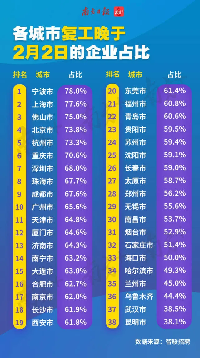 同樣根據(jù)這份《報(bào)告》,全國(guó)各城市晚于2月2日復(fù)工的企業(yè)占比統(tǒng)計(jì)排名顯示,前10名中9個(gè)城市均為南方城市,寧波企業(yè)延遲復(fù)工響應(yīng)度最高,確定2月2日后復(fù)工的企業(yè)占比達(dá)到了78%。前10名中4個(gè)為廣東城市,分別是佛山、深圳、珠海、廣州。