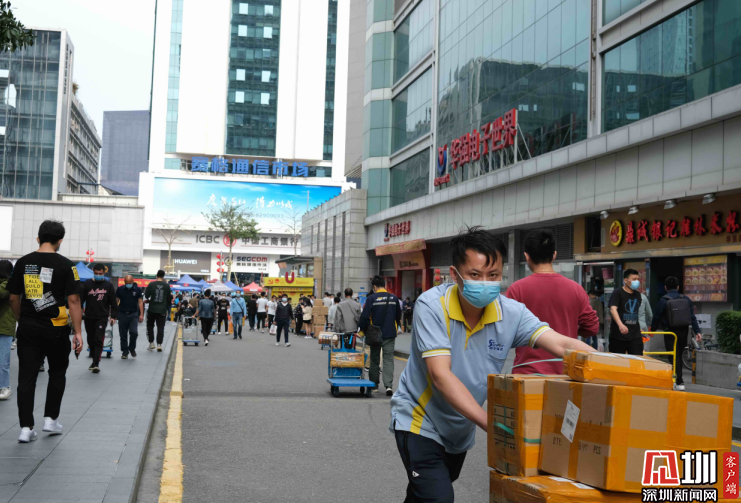 3月16日,華強(qiáng)電子世界附近,一位推著平板車的人。