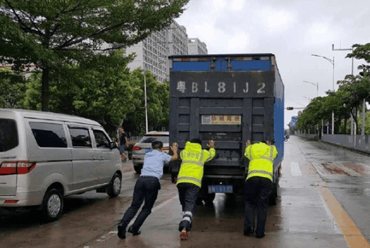 你們,在瓢潑大雨中幫助車(chē)主推車(chē);