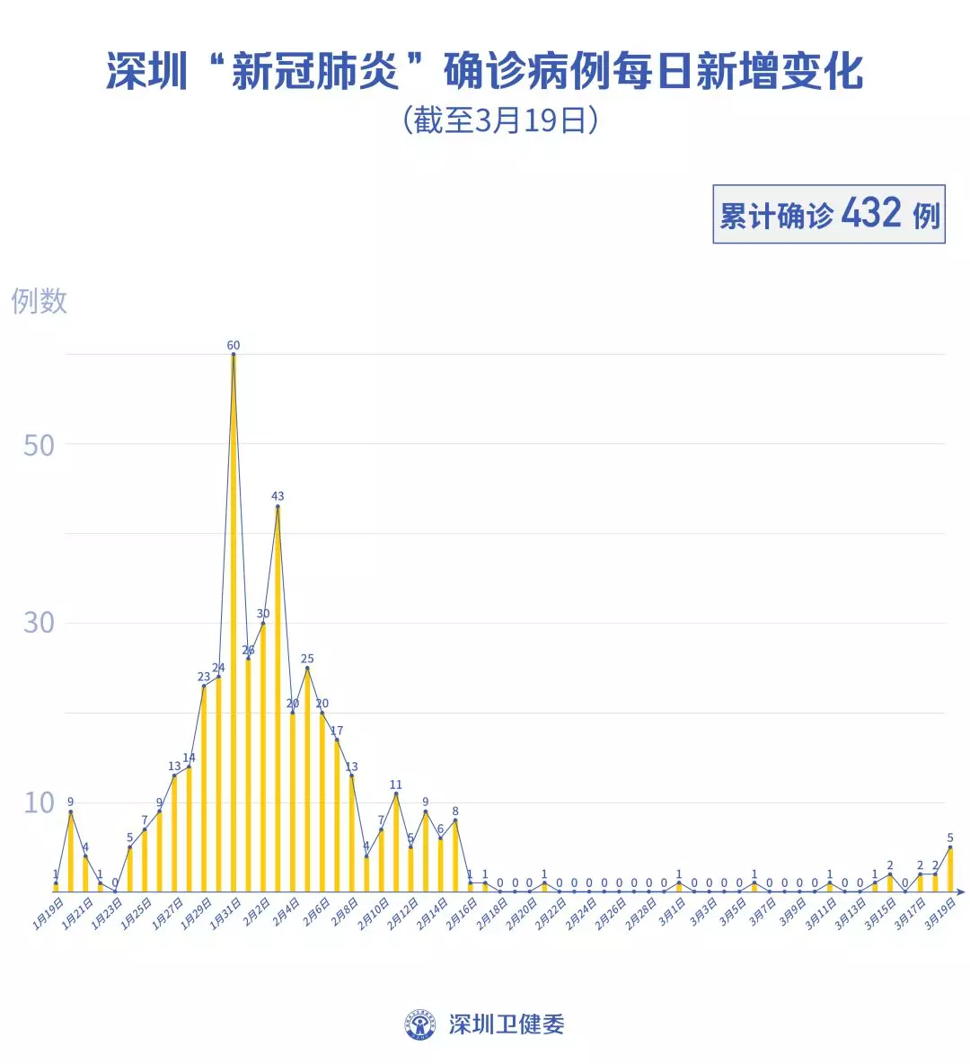 截至3月19日24時(shí),深圳累計(jì)報(bào)告“新冠肺炎”病例432例。3月19日當(dāng)天新增5例,出院2例。
