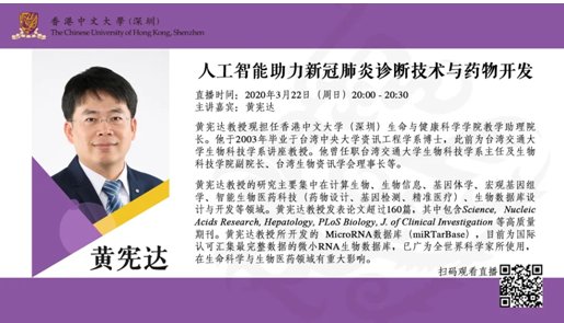 黃憲達教授現(xiàn)擔(dān)任香港中文大學(xué)(深圳)生命與健康科學(xué)學(xué)院教學(xué)助理院長、瓦謝爾計算生物研究院執(zhí)行院長。他于2003年畢業(yè)于臺灣中央大學(xué)資訊工程學(xué)系博士,此前為臺灣交通大學(xué)生物科技學(xué)系講座教授。他曾任職臺灣交通大學(xué)生物科技學(xué)系主任及生物科技學(xué)院副院長、臺灣生物資訊學(xué)會理事長等。