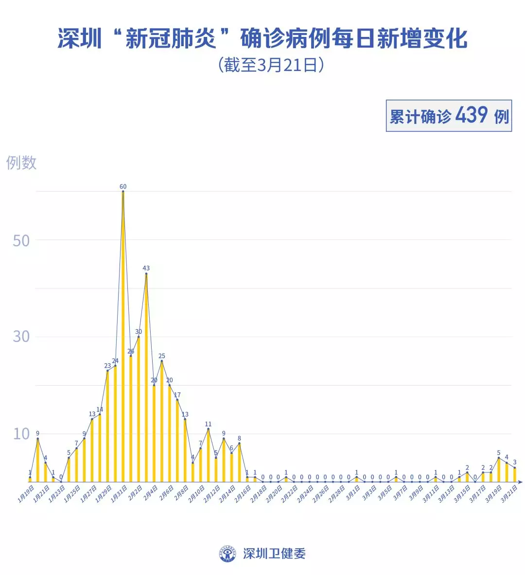 截至3月21日24時(shí),深圳累計(jì)報(bào)告“新冠肺炎”病例439例。3月21日當(dāng)天新增3例,出院1例。