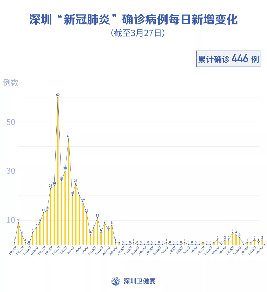 截至3月27日24時,深圳累計(jì)報(bào)告“新冠肺炎”病例446例。3月27日當(dāng)天新增2例。