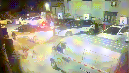 監(jiān)控畫面顯示,25日晚上23點(diǎn)左右,一輛出租車和一輛面包車先后到達(dá)龍崗大道木棉灣路段的一個(gè)充電站。出租車司機(jī)先找到了一個(gè)位置,準(zhǔn)備倒入充電時(shí),后面的面包車突然往前開,兩名司機(jī)因?yàn)橥\囄坏膯栴}發(fā)生爭執(zhí)。隨后,出租車司機(jī)下車?yán)碚摚瑒邮滞妻嗣姘囁緳C(jī)一下。
