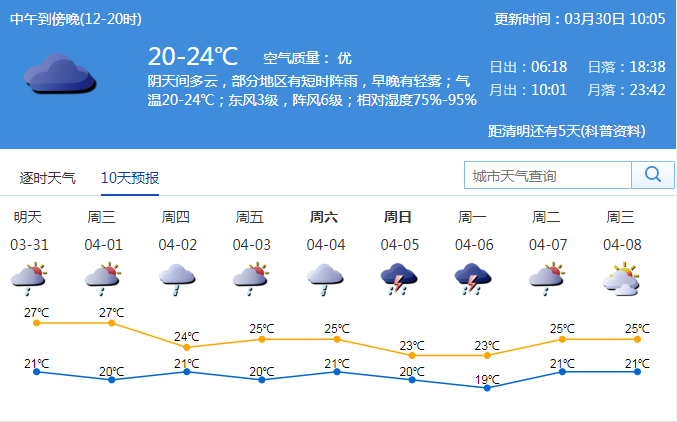 市氣象臺(tái)預(yù)測,31日至4月1日有陣雨或雷陣雨;2-3日多云到陰天,部分時(shí)間有分散小雨;展望清明假期期間,有明顯降雨過程。注意雨霧天氣低能見度對交通安全的影響。
