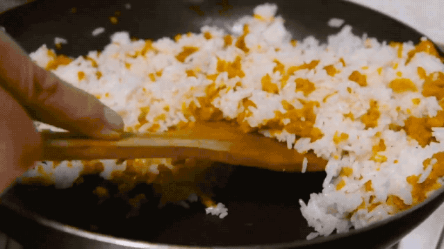 油鍋燒熱,不斷翻炒海膽,直到把海膽的水分炒干,只有動(dòng)作快和把握好火候,才能保留海膽的鮮度。海膽炒得呈粒狀就可加入蒜蓉,這樣可以更好地刺激海膽香味。把米飯和海膽融合一起翻炒,使每一粒米飯都充分接觸油和熱量,這樣的炒飯才會(huì)松軟可口。最后加一點(diǎn)醬油,灑上一把蔥花銷(xiāo)魂的海膽炒飯就出爐啦。