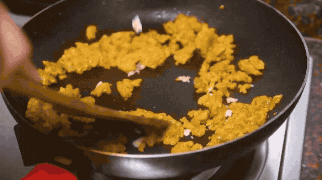 海膽炒得呈粒狀加入蒜蓉