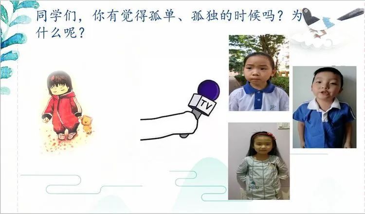 在劉老師的課堂上,她帶來《樹和喜鵲》故事中主人公小喜鵲日記本獎勵讀書流利、情感充沛的孩子們。通過小喜鵲的日記,婉儀老師將課堂成功地轉接到課文的文本當中。進而有對文章中出現的事物、事物所具備的特點展開了細致而有趣的學習。期間,婉儀老師還化身小記者,用三段對于自己學生的采訪視頻,讓學生對于“孤單”二字有了更加深刻的理解。