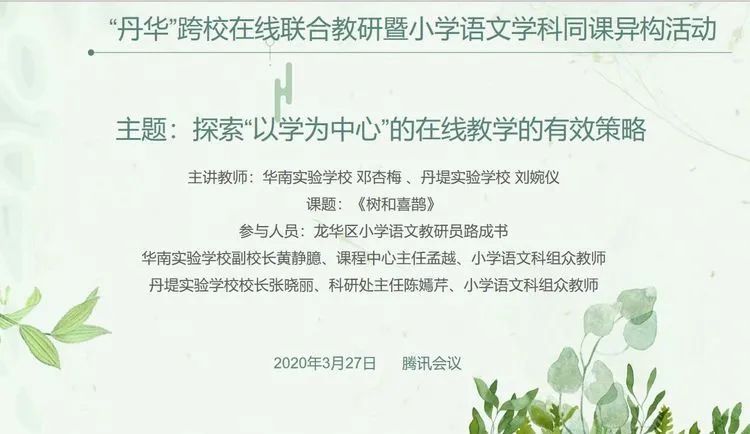 見圳客戶端、深圳新聞網2020年3月31日訊 (記者 潘寶儀)丹堤實驗學校與華南實驗學校異苔同岑,相聚“丹華”,以鄧杏梅老師與劉婉儀老師關于《樹和喜鵲》的同課異構為課例,開展了丹華跨?!耙詫W為中心”的小學語文在線教學策略研討會。