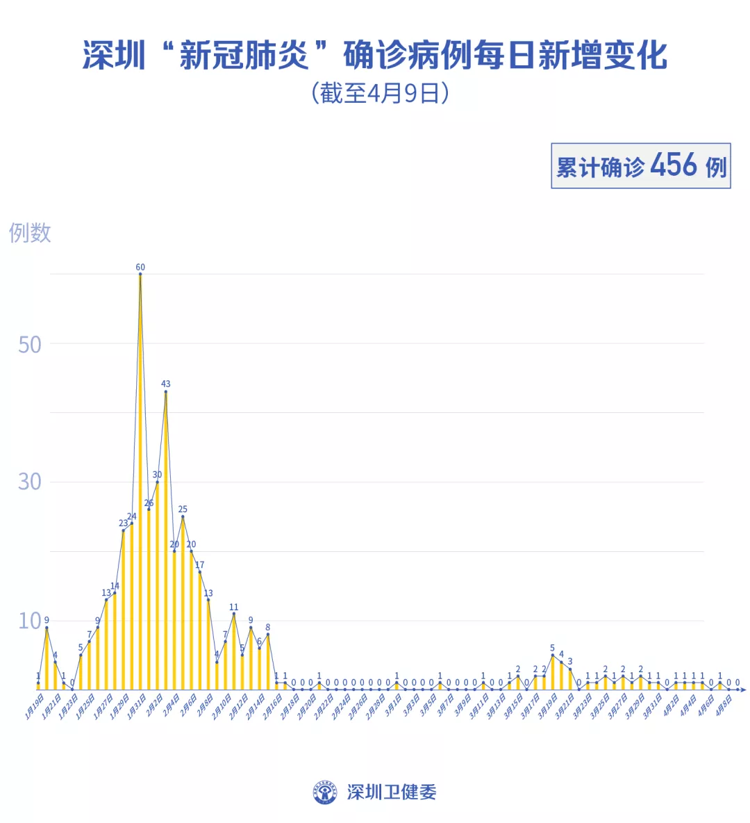 截至4月9日24時,深圳累計報告新冠肺炎病例456例。4月9日當天新增出院1例。