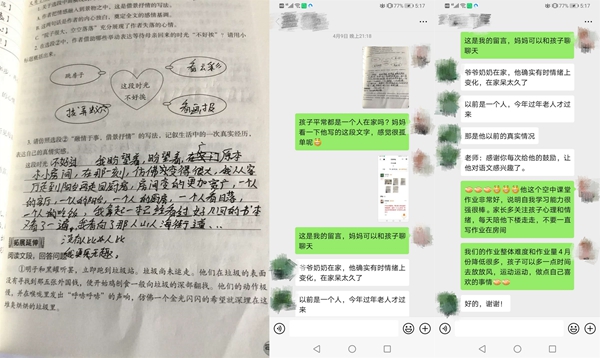 疫情來的迅猛又猝不及防,老師們一方面要完成教學任務、引導學生做好防疫,一方面要時刻關注學生的心理健康。學生們被迫在家度過了一個史上最長的寒假,對于處在叛逆期的孩子們來說,難免會與家人出現(xiàn)一些矛盾,在課堂之外,老師們還需要擔任“心理調(diào)節(jié)師”的角色。一次,周老師班上有個同學因為上網(wǎng)課的事情與父母鬧了矛盾,一氣之下跑到奶奶家,周老師得知了這件事情,第一時間聯(lián)系上學生,通過鼓勵、引導,讓學生認識到自己的錯誤,與父母和解。還有一次,周老師通過批改作業(yè),發(fā)現(xiàn)一名學生在作業(yè)中吐露了自己孤獨、無趣的心聲??吹胶?,周老師立刻與家長溝通了解情況,并建議家長多多陪伴孩子。盡管老師和學生們不能在學校的課堂上相聚,但在通訊十分發(fā)達的現(xiàn)在,老師們也始終用自己的方式陪伴在學生左右。