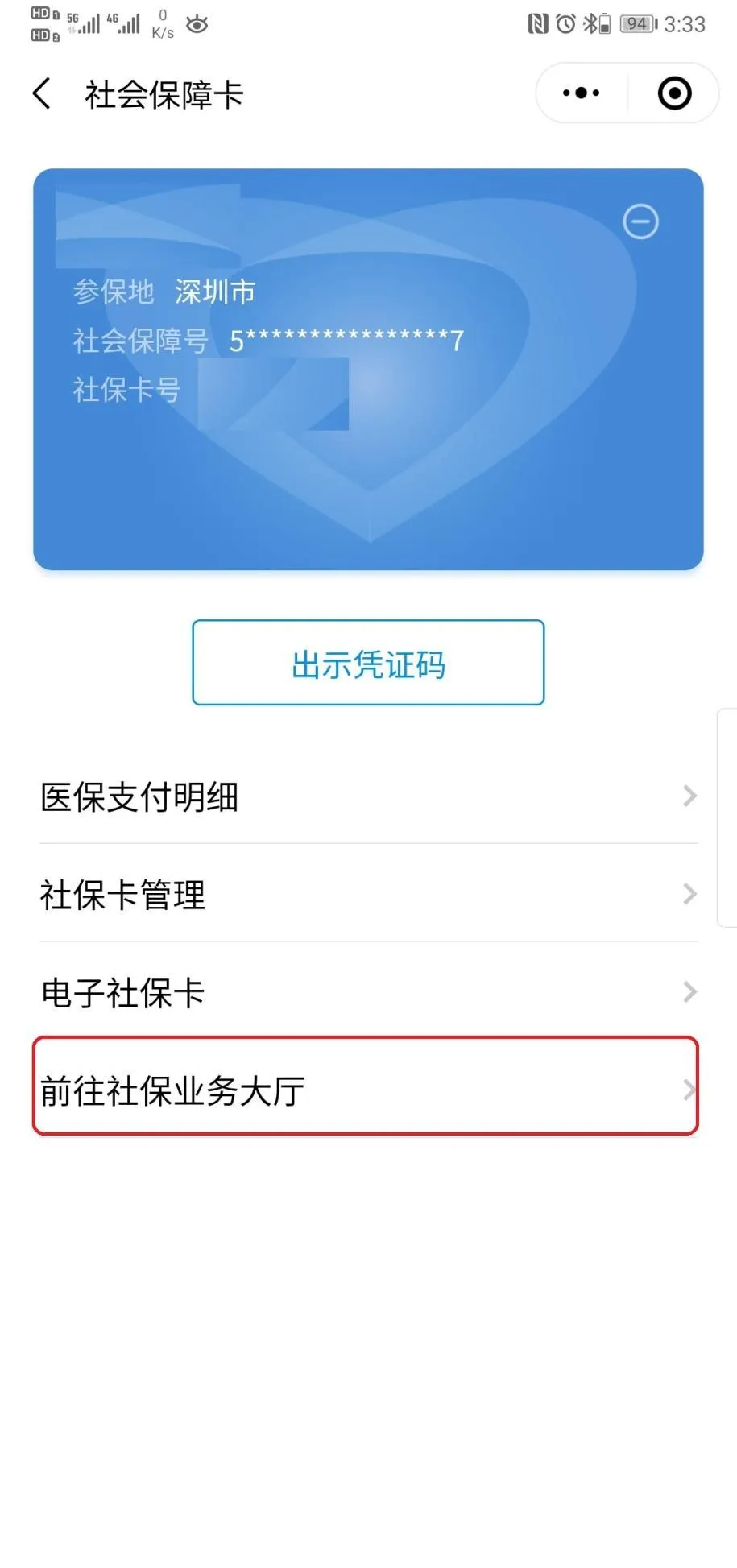2、添加后點(diǎn)擊進(jìn)入“社會保障卡”—“前往社保業(yè)務(wù)大廳”;