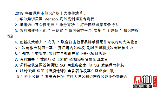 值得關(guān)注的是,在深圳市知識產(chǎn)權(quán)工作會議期間,全市2019年度知識產(chǎn)權(quán)十大事件正式對外發(fā)布,華為起訴美國Verizon、騰訊訴中禁令獲支持、“有為”聯(lián)合打擊假冒品牌手機(jī)配件專項行動完美收官等事件上榜。
