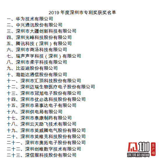 會議同期還發(fā)布了2019年度深圳市專利獎獲獎企業(yè)名單,華為技術(shù)有限公司、中興通訊股份有限公司、深圳市大疆創(chuàng)新科技有限公司、深圳光峰科技股份有限公司、騰訊科技(深圳)有限公司、深圳市商湯科技有限公司、瑞聲聲學(xué)科技(深圳)有限公司等23家單位獲獎。