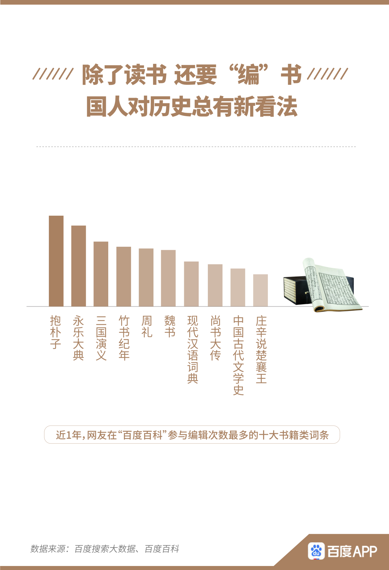 不僅讀書(shū),這一屆網(wǎng)友還要“編”書(shū)。其中,網(wǎng)友對(duì)歷史著作總有新看法。報(bào)告顯示,近1年,網(wǎng)友在百度百科參與編輯次數(shù)最多的十大書(shū)籍類詞條,歷史著作占7席?!队罉?lè)大典》在600年后仍舊“編輯”不停。