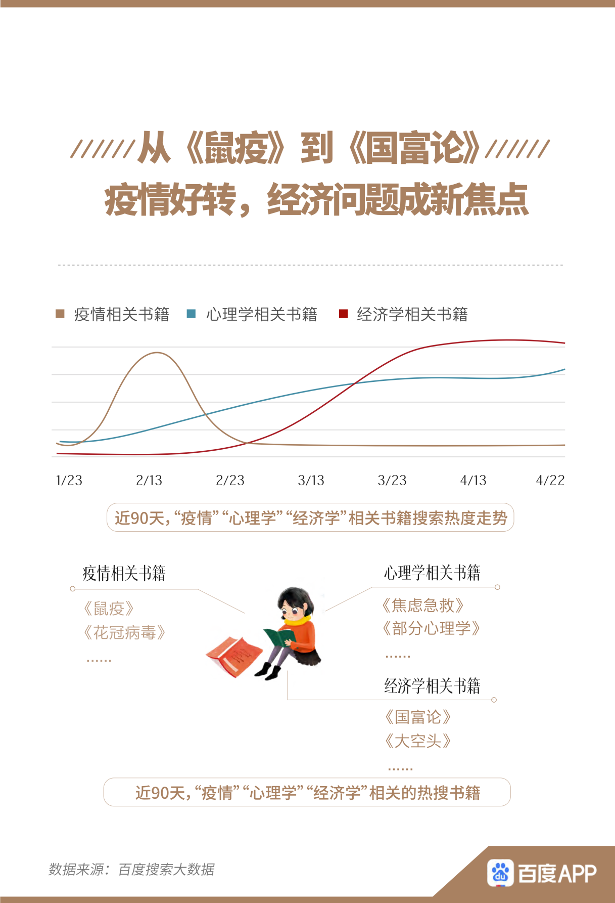 與此同時(shí),疫情變化也影響著人們的閱讀“口味”。報(bào)告顯示,在疫情暴發(fā)之初,與“疫情”相關(guān)書(shū)籍的搜索熱度迅速上升,《鼠疫》、《花冠病毒》等具有疫情背景的書(shū)籍成為熱搜。隨著國(guó)內(nèi)疫情好轉(zhuǎn),疫情對(duì)心理、經(jīng)濟(jì)的影響逐漸受到人們更多關(guān)注,《焦慮急救》、《國(guó)富論》等“心理學(xué)”、“經(jīng)濟(jì)學(xué)”相關(guān)書(shū)籍的搜索熱度均在3月上漲。