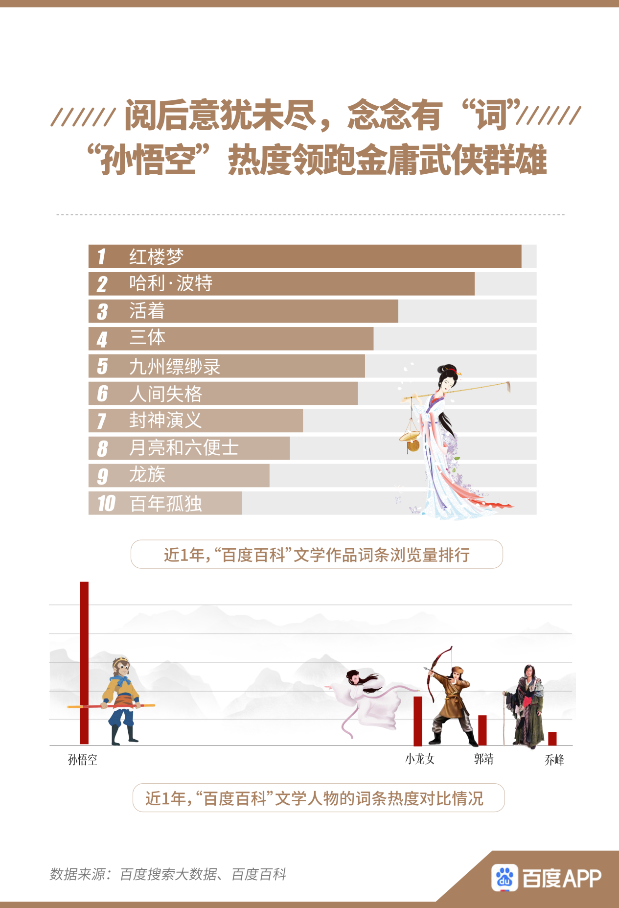 而百度百科的數(shù)據(jù)表明,人們?cè)陂喿x經(jīng)典書(shū)籍后,點(diǎn)擊詞條查看更多背景、釋義也是常態(tài)?!都t樓夢(mèng)》、《哈利·波特》、《活著》、《三體》是近1年來(lái)網(wǎng)友在百度百科瀏覽較多的文學(xué)作品相關(guān)詞條。
