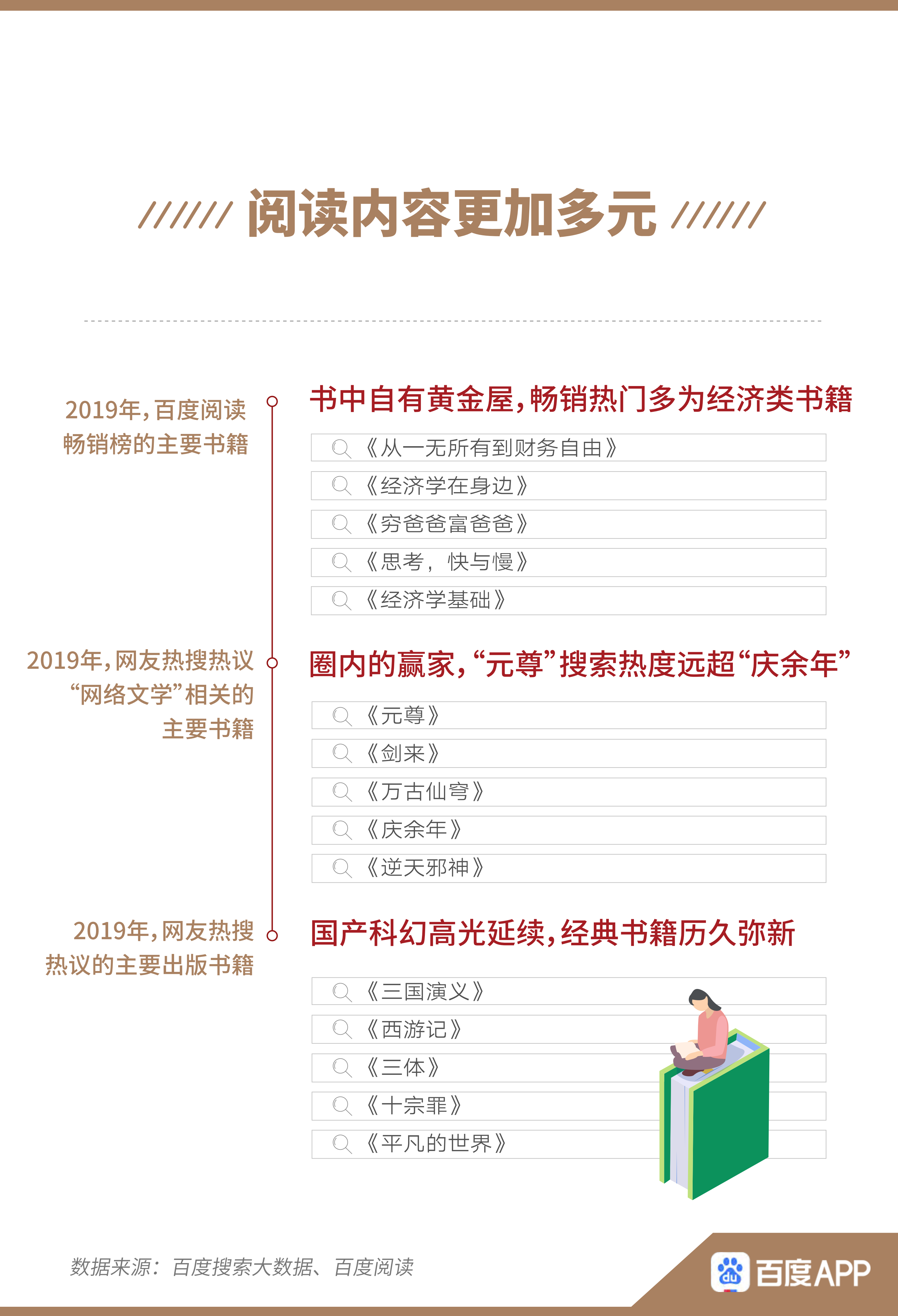 閱讀既有不同地域、年齡、性別等產(chǎn)生的差異,也有明顯的興趣趨勢(shì)。報(bào)告指出,百度閱讀2019年暢銷熱門多為經(jīng)濟(jì)類書(shū)籍,人們學(xué)習(xí)理財(cái)投資的意識(shí)增強(qiáng)?!熬W(wǎng)絡(luò)文學(xué)”體現(xiàn)出強(qiáng)大的“圈層”能量,即便已破圈的《慶余年》,其搜索熱度依舊不敵《元尊》。而在網(wǎng)友熱搜熱議的主要出版書(shū)籍中,《三國(guó)演義》、《西游記》等經(jīng)典書(shū)籍歷久彌新,位居前列。