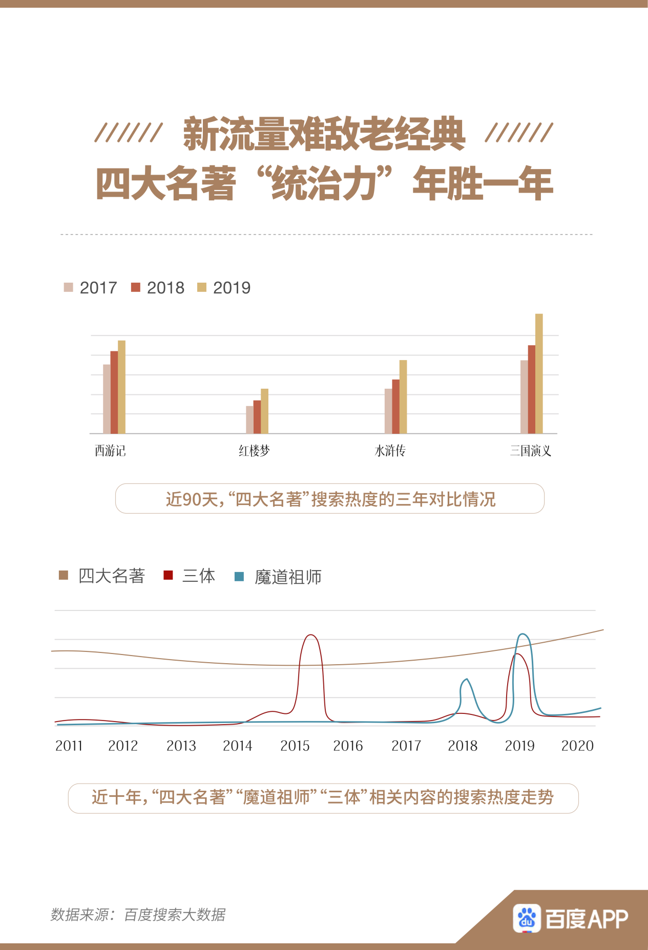 報(bào)告指出,近90天,“四大名著”搜索熱度的三年對(duì)比情況呈現(xiàn)出年年上升的趨勢(shì),對(duì)比如《三體》、《魔道祖師》等近年的熱門書(shū)籍,四大名著搜索熱度走勢(shì)更加穩(wěn)定向上,體現(xiàn)出強(qiáng)大的“統(tǒng)治力”。
