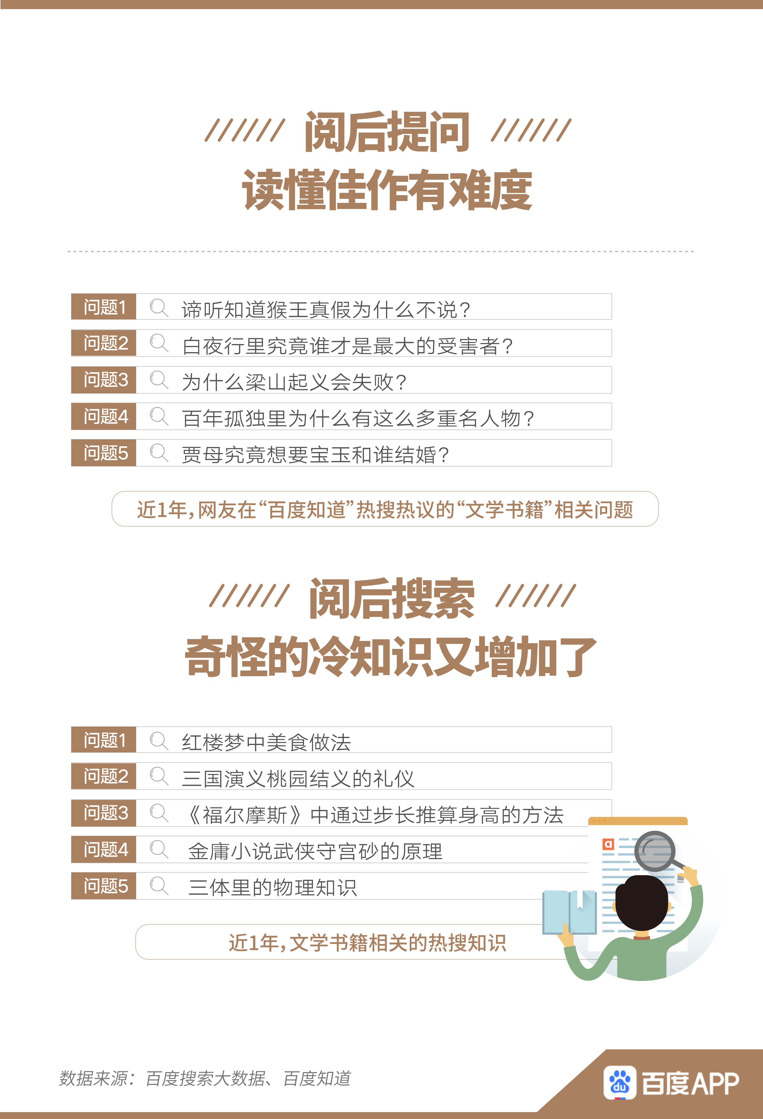閱后提出對(duì)書(shū)籍的疑惑、討論思考、參與表達(dá),均是讀者的重要需求。報(bào)告顯示,近1年,不少網(wǎng)友在閱讀之后,選擇到百度知道提問(wèn)、討論。例如,“諦聽(tīng)知道猴王真假為什么不說(shuō)”、“白夜行究竟誰(shuí)是最大受害者”等情節(jié)相關(guān)問(wèn)題,均引起網(wǎng)友的熱搜熱議。除此之外,在百度搜索與主要情節(jié)無(wú)關(guān)的“冷”知識(shí)的人也不在少數(shù),如“紅樓夢(mèng)中美食做法”、“三體里的物理知識(shí)”等。