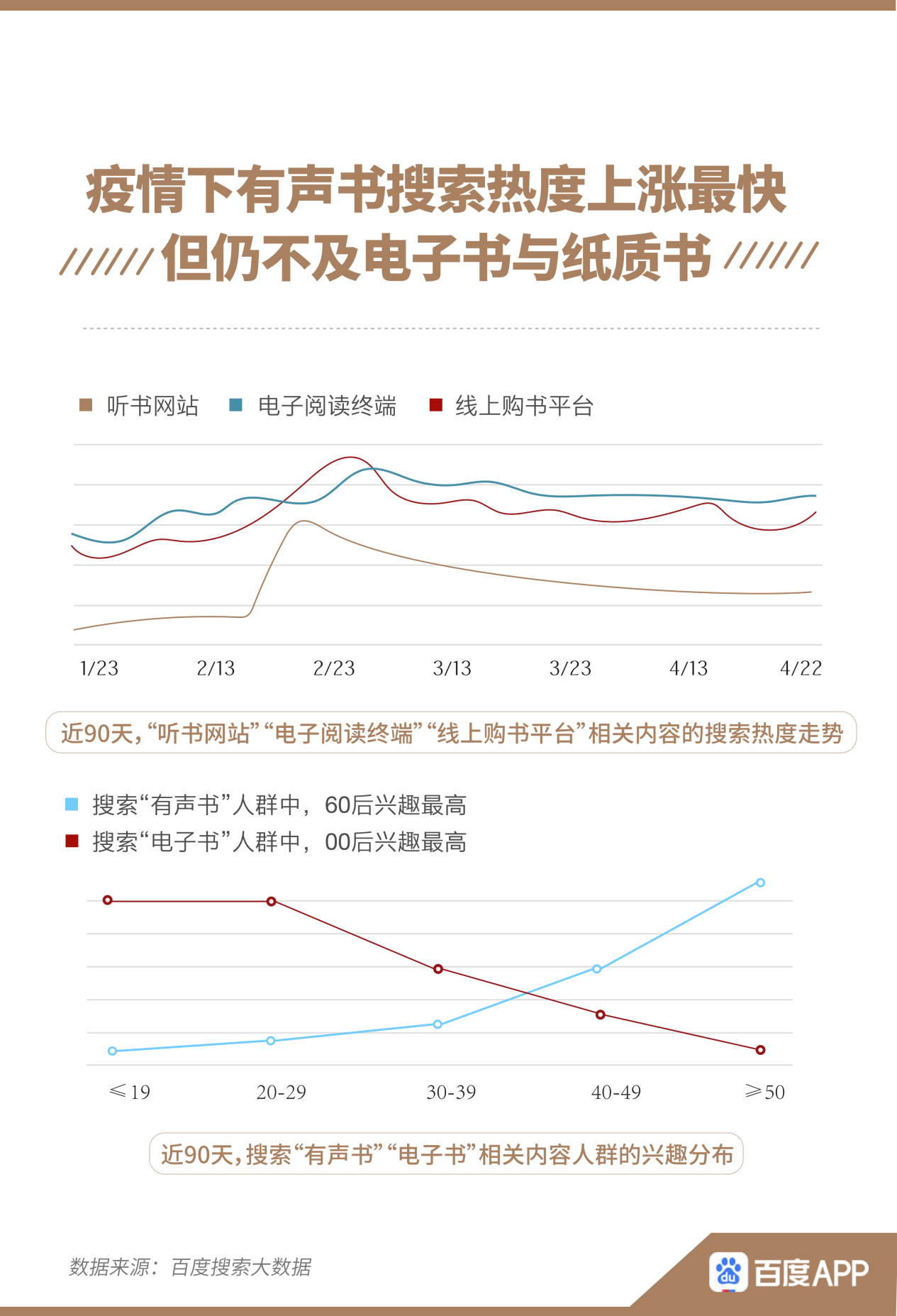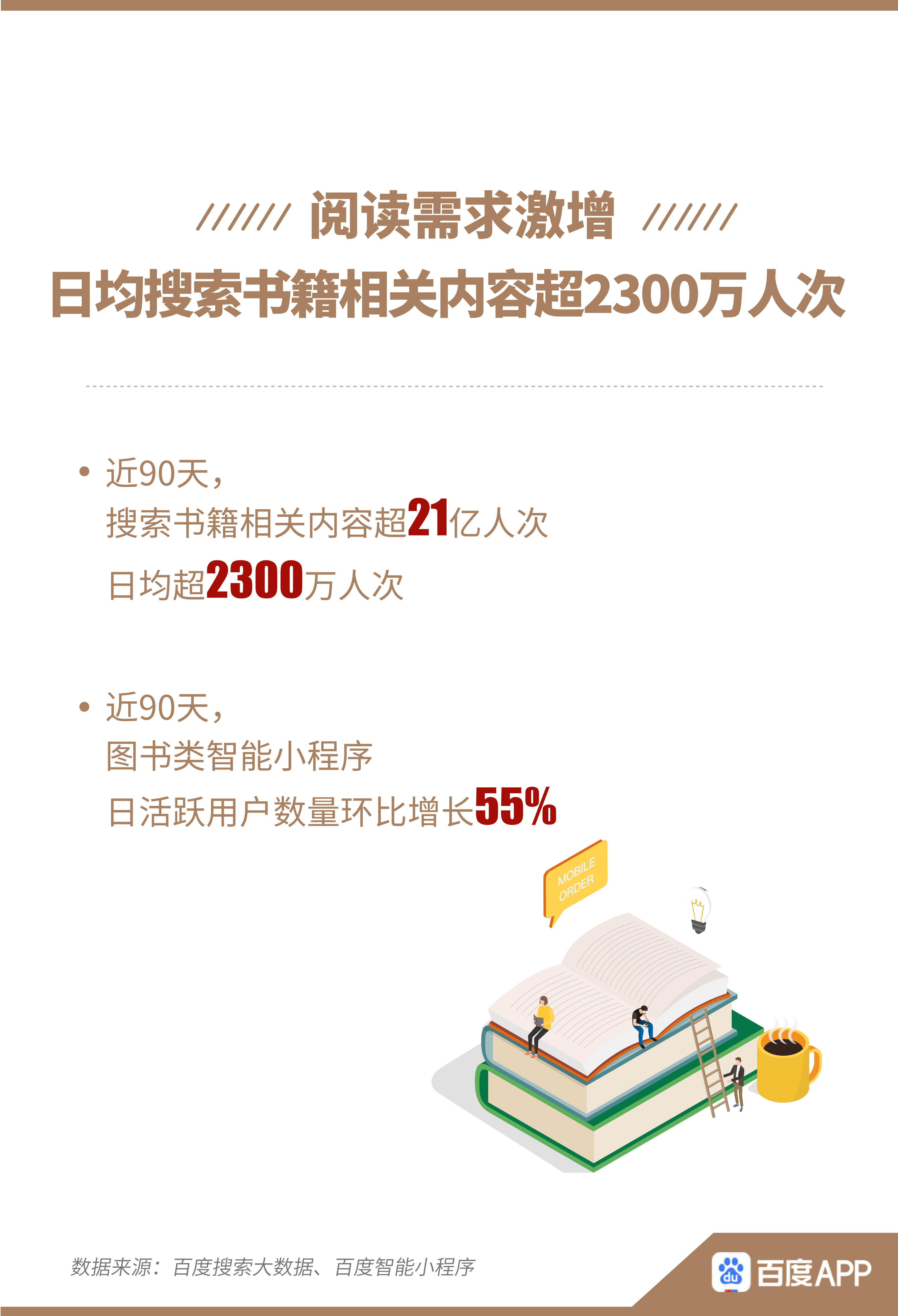 近日,百度APP聯(lián)合人民日?qǐng)?bào)數(shù)字傳播《有數(shù)青年》工作室發(fā)布的《百度全民讀書(shū)搜索大數(shù)據(jù)報(bào)告》(以下簡(jiǎn)稱“報(bào)告”)顯示,疫情宅家使網(wǎng)友閱讀需求激增,近90天,日均超2300萬(wàn)人次在百度搜索書(shū)籍相關(guān)內(nèi)容,累計(jì)超21億人次,圖書(shū)類智能小程序日活躍用戶環(huán)比增長(zhǎng)55%,讀書(shū)、購(gòu)書(shū)線上化再進(jìn)一步。