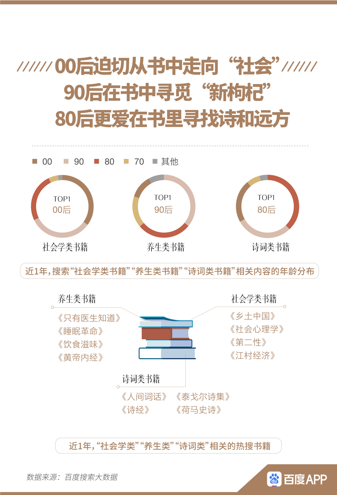 除了地區(qū)出現(xiàn)閱讀差異,不同年齡的讀者也有相應(yīng)特征。報(bào)告顯示,00后在閱讀上呈現(xiàn)出對(duì)社會(huì)議題的關(guān)注,是搜索社會(huì)學(xué)類書(shū)籍最多的人群。