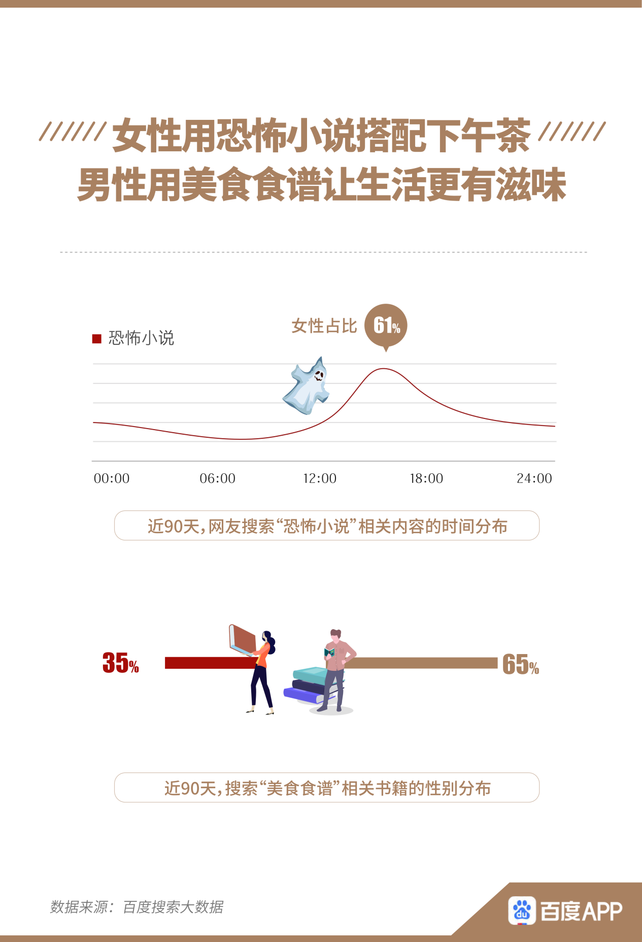 與往常印象相反,搜索“恐怖小說(shuō)”相關(guān)內(nèi)容的人群中,女性比男性更多,占比61%,下午15時(shí)是搜索的高峰時(shí)間。而男性更關(guān)注“美食食譜”相關(guān)書(shū)籍,在搜索相關(guān)書(shū)籍的人群中占比65%。
