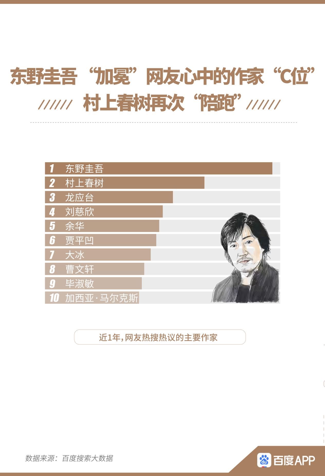 經(jīng)典深入人心,也無(wú)礙閱讀世界百家爭(zhēng)鳴。報(bào)告盤(pán)點(diǎn)了近1年網(wǎng)友熱搜熱議的主要作家,推理小說(shuō)家東野圭吾占熱度C位,村上春樹(shù)位居第二,再“陪跑”。
