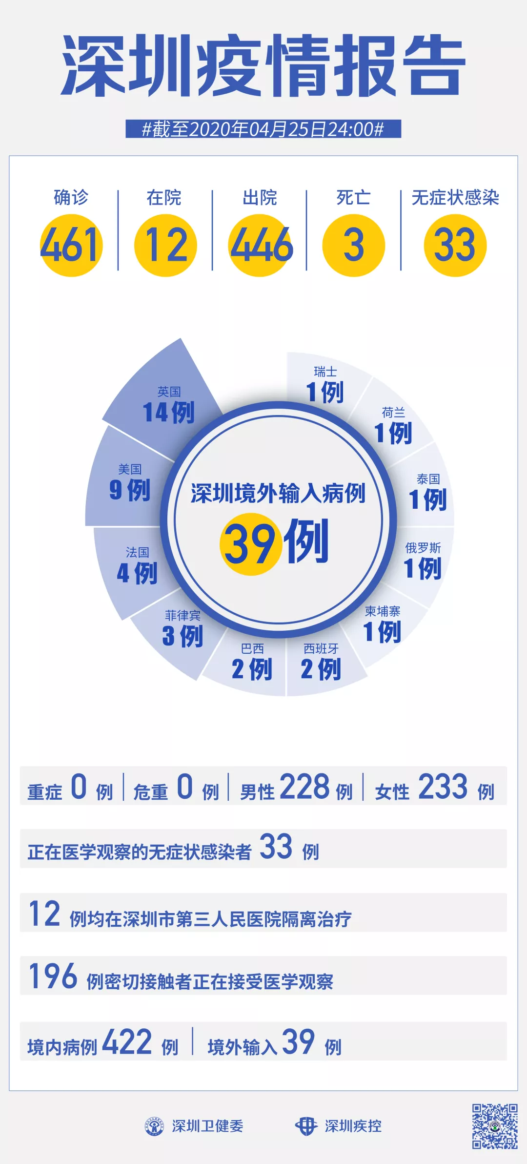 截至4月25日24時(shí),深圳累計(jì)報(bào)告新冠肺炎病例461例。