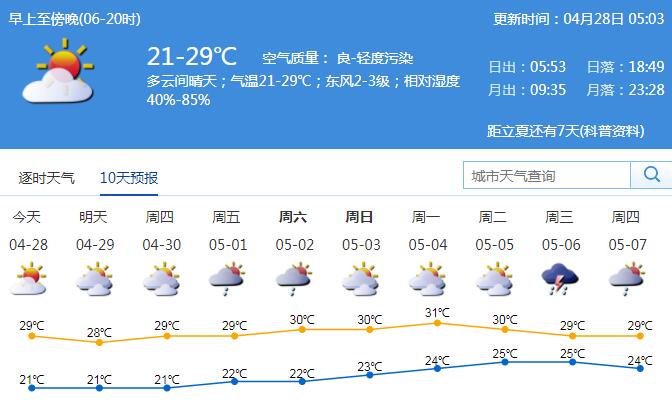 見圳客戶端·深圳新聞網(wǎng)2020年4月28日訊 28日多云間晴天,氣溫21-29℃,東風(fēng)2-3級(jí),相對(duì)濕度40%-85%;29-30日多云為主,空氣較干燥;5月1-5日轉(zhuǎn)偏南暖濕氣流影響,多云,部分時(shí)間有分散陣雨,早晚有輕霧。