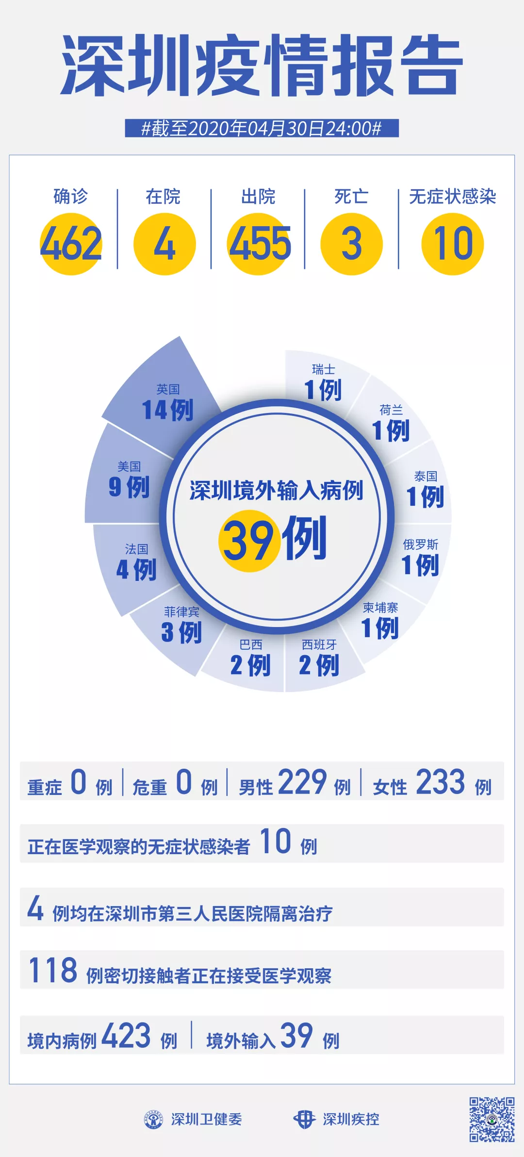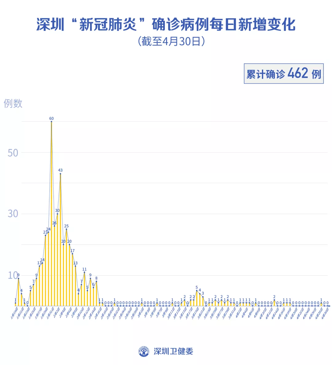截至4月30日24時(shí),深圳累計(jì)報(bào)告新冠肺炎病例462例。4月30日當(dāng)天新增無癥狀感染者2例,出院1例。