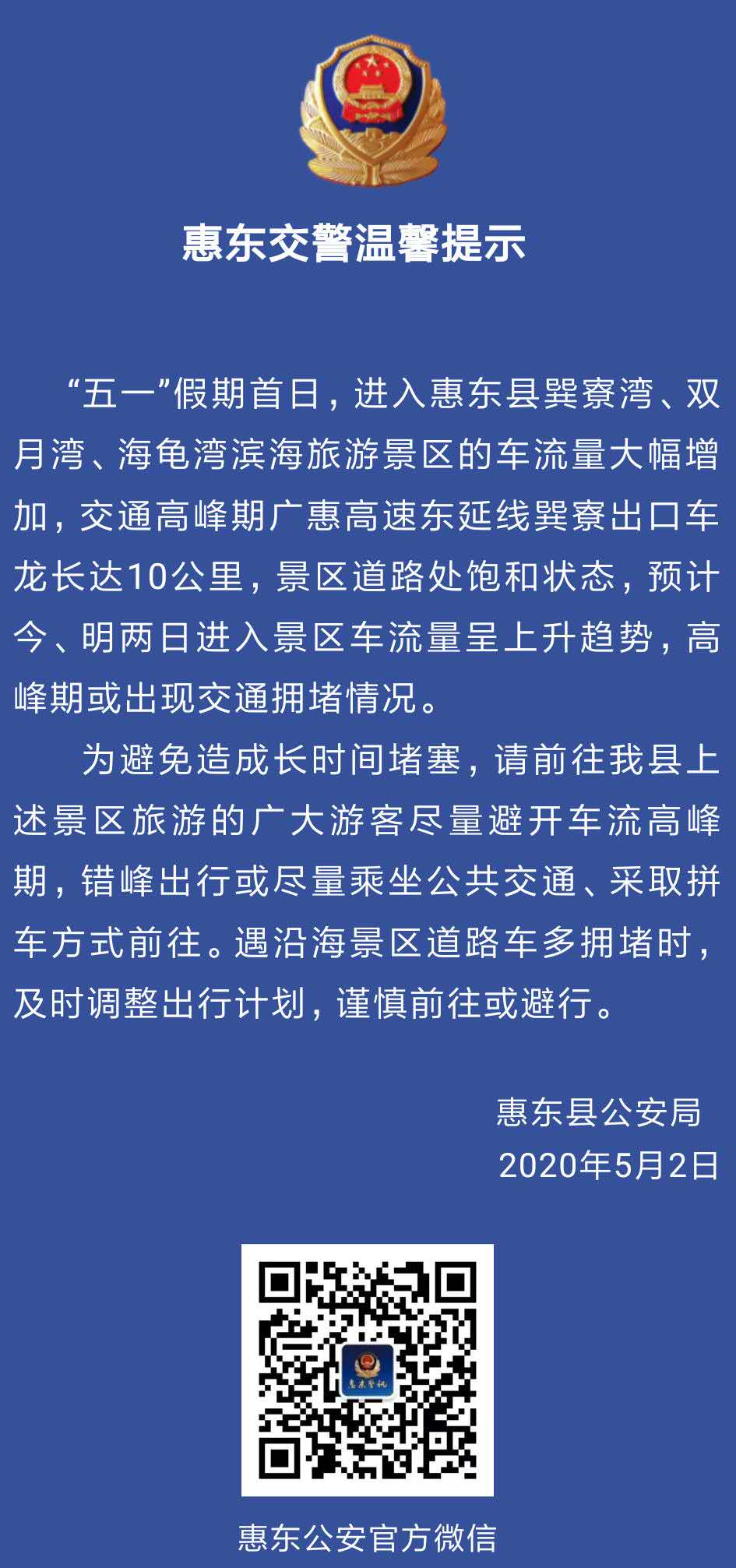 見(jiàn)圳客戶端·深圳新聞網(wǎng)2020年5月2日訊(深圳特區(qū)報(bào)記者 陳海峰 通訊員 羅漢波 文/圖)5月2日,惠州市公安局發(fā)布緊急提醒稱,“五一”假期首日,進(jìn)入廣東省惠州市惠東縣巽寮灣、雙月灣、海龜灣濱海旅游景區(qū)的車流量大幅增加,交通高峰期,廣惠高速東延線巽寮出口車龍長(zhǎng)達(dá)10公里,景區(qū)道路處飽和狀態(tài)。