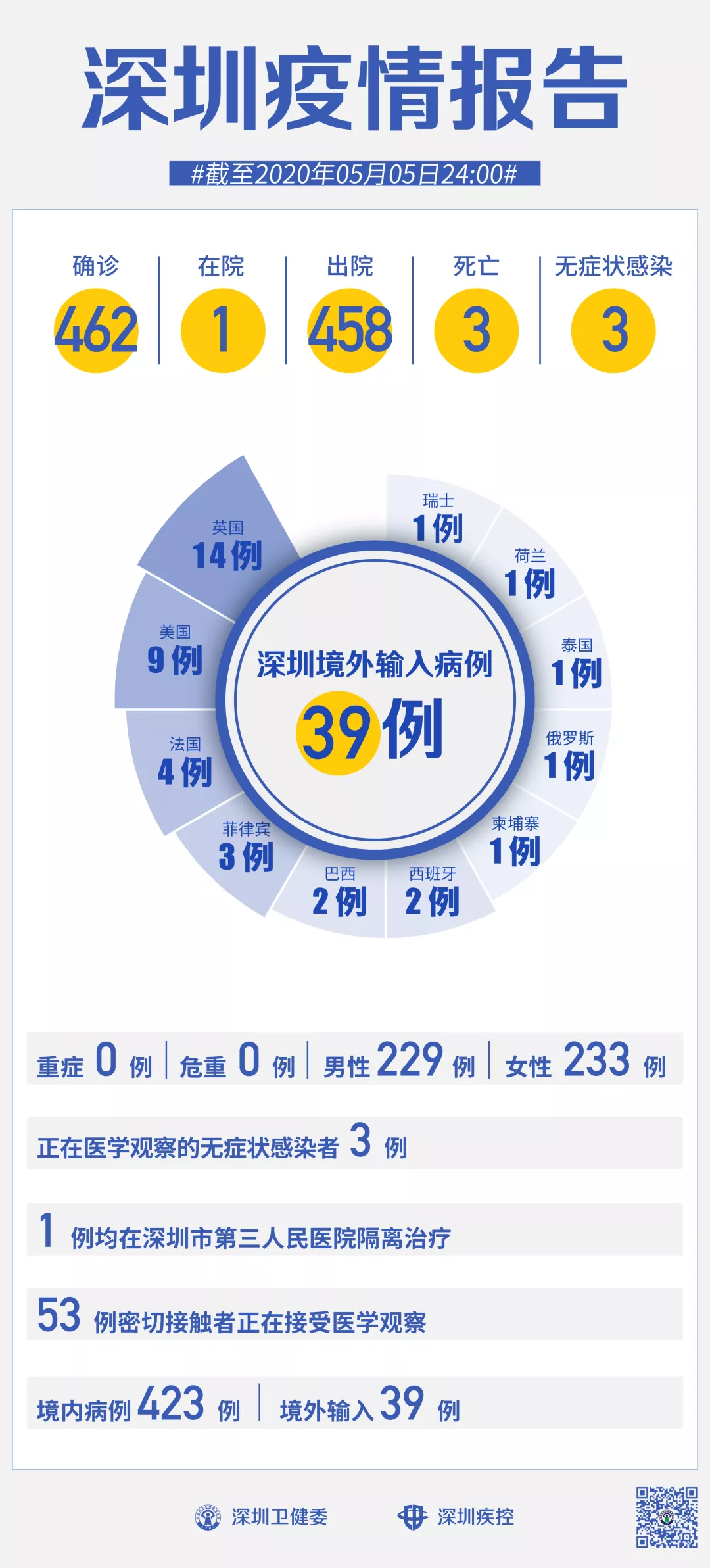 截至5月5日24時(shí),深圳累計(jì)報(bào)告新冠肺炎病例462例。5月5日當(dāng)天新增出院1例。