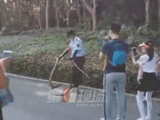 最近,兩條體型碩大的蛇突然在蓮花山公園人行道旁邊的草叢出沒,隨后,一名公園內的保安人員徒手捕捉了兩條蛇。