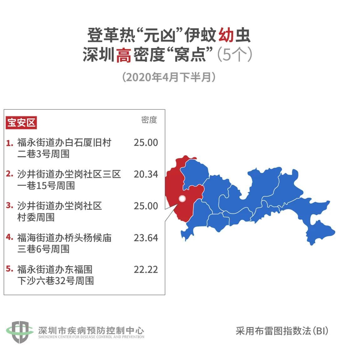 據(jù)悉,在全市設(shè)置的423個(gè)監(jiān)測(cè)點(diǎn)中,不合格的有104個(gè),占24.59%。其中低密度有79個(gè),中密度有20個(gè),高密度有5個(gè)。5個(gè)“蚊子窩”全在寶安!