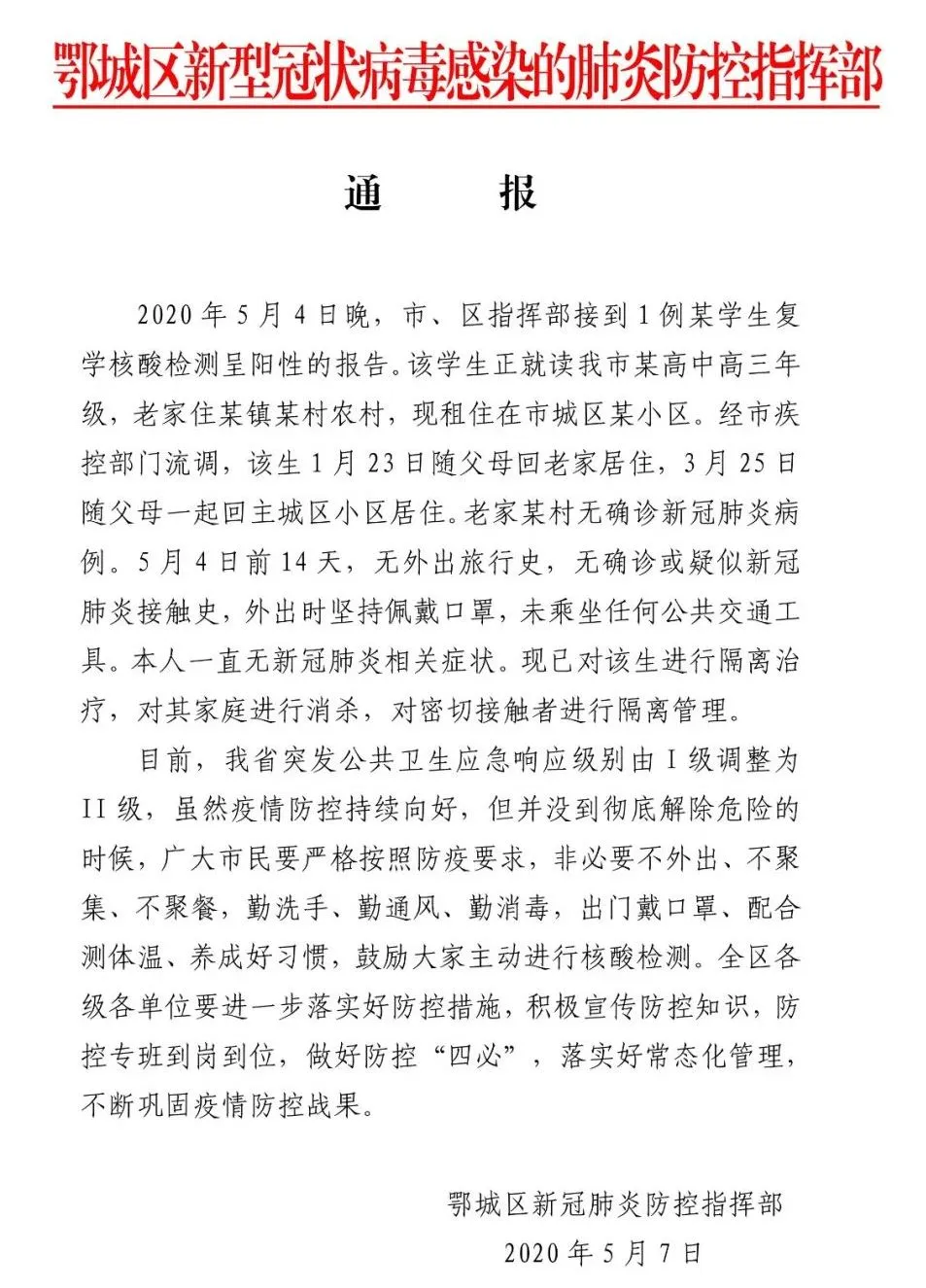 5月8日,湖北鄂州市鄂城區(qū)政府網站發(fā)布一則鄂城區(qū)新冠肺炎防控指揮部通報。
