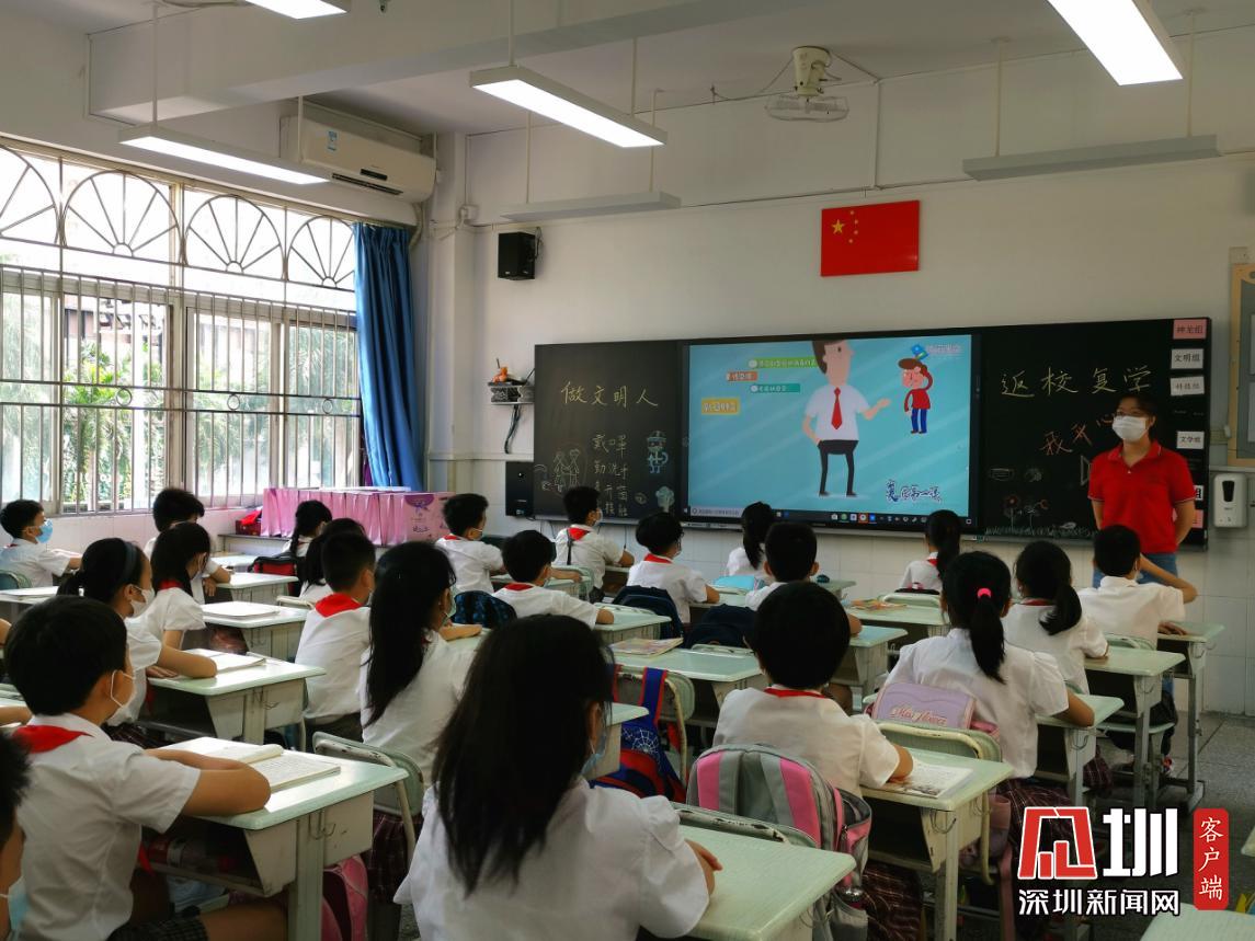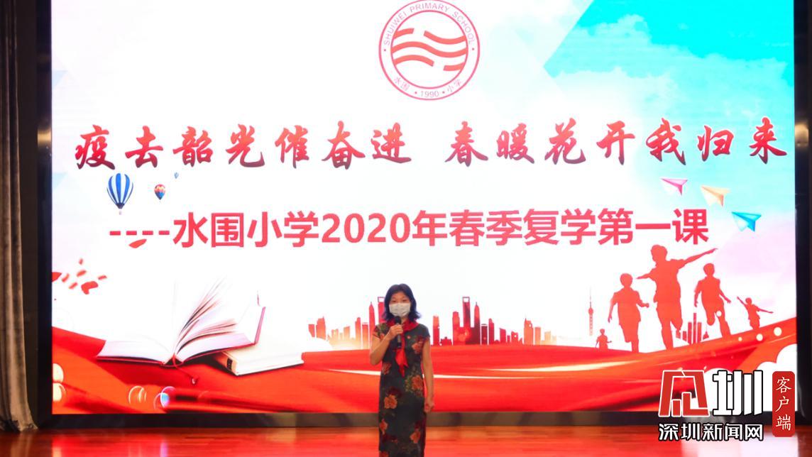 據(jù)悉,水圍小學(xué)“復(fù)學(xué)典禮”上午8:40正式開始,出席的嘉賓有福田區(qū)教科院教研員、少先隊(duì)總輔導(dǎo)員李楠、衛(wèi)生健康副校長明昭。各班級(jí)的學(xué)生則帶著口罩,單人單桌在教室內(nèi),以觀看直播的方式參加典禮。